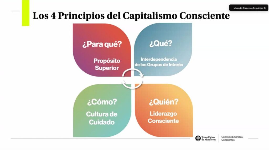 Francico Fernández González subrayó que el capitalismo consciente se sostiene en cuatro pilares que funcionan de manera interdependiente: